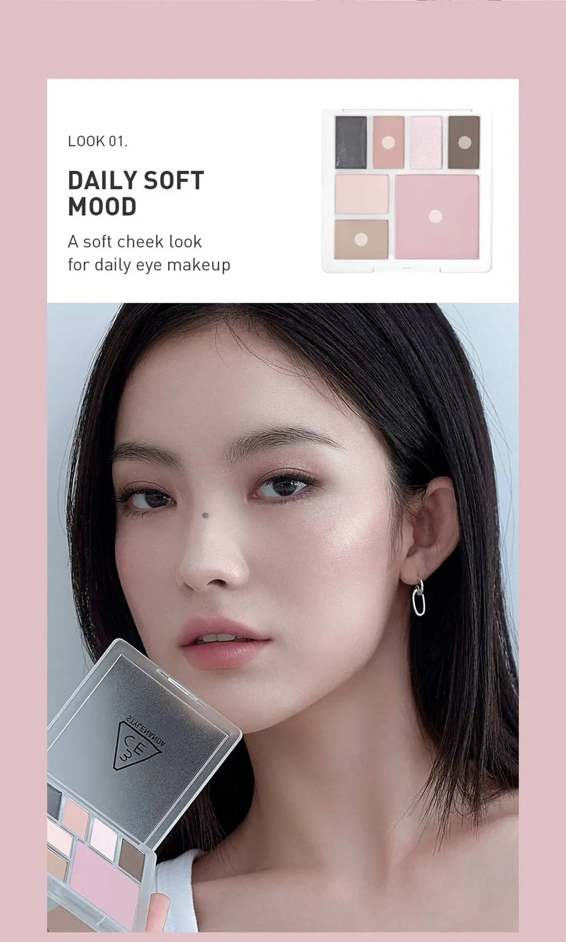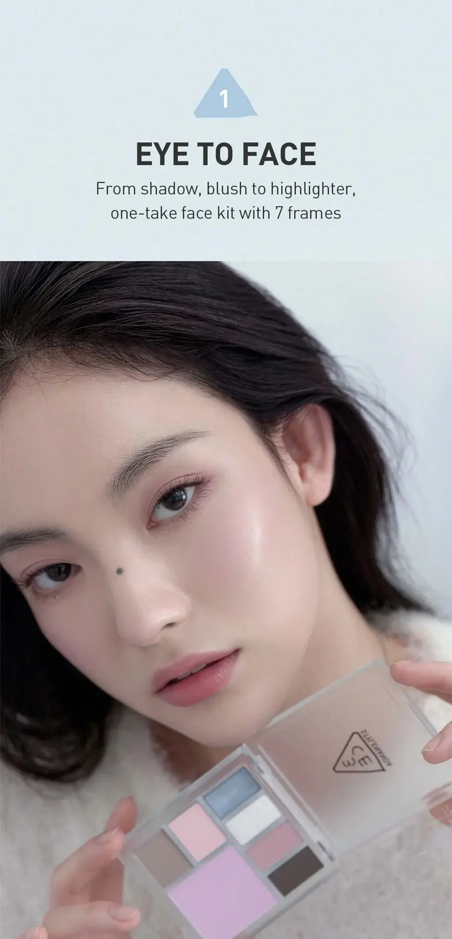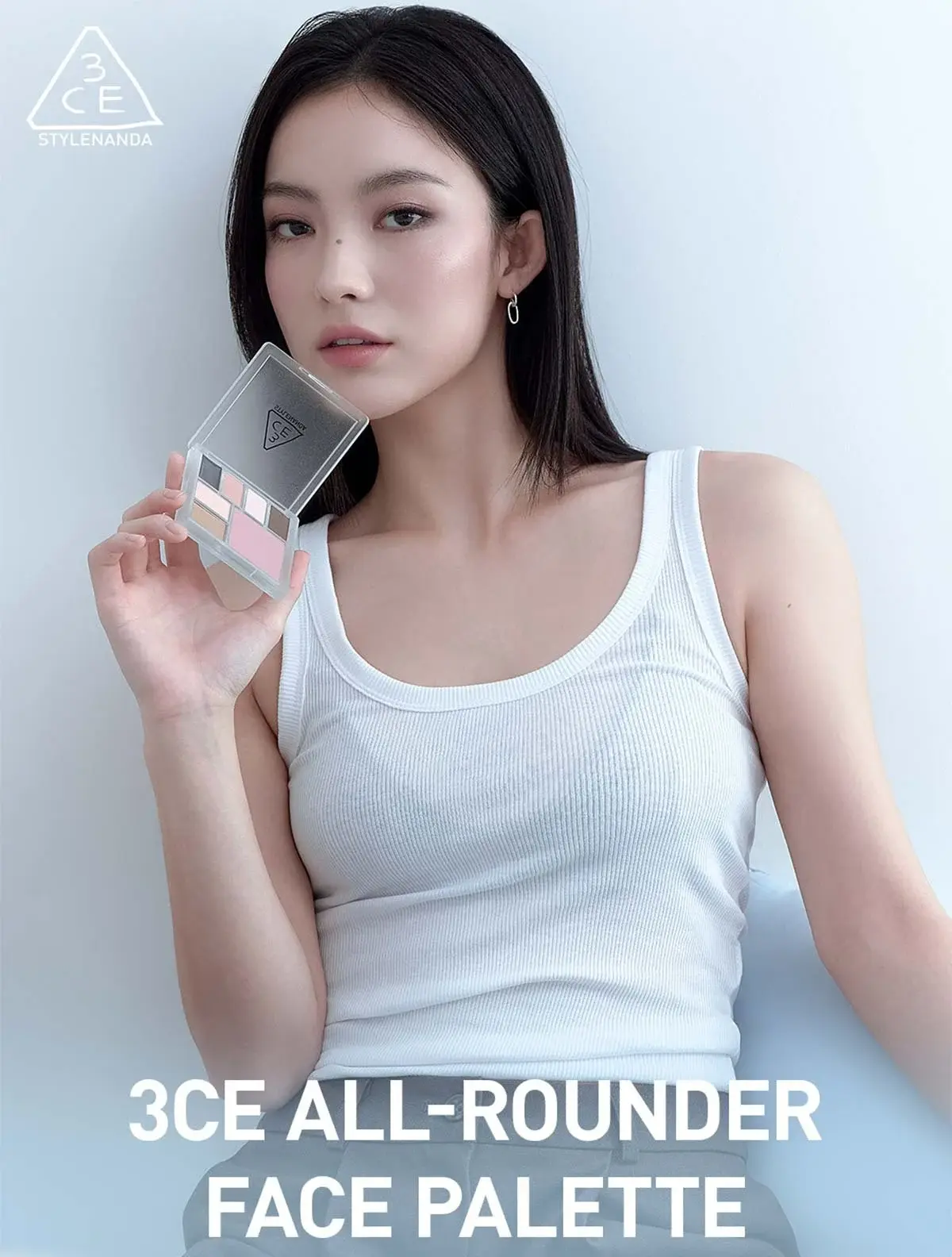 The 3CE All Rounder Face Palette is a versatile, multi-use makeup product designed for achieving a complete look with one compact item. Its primary functions include serving as an eyeshadow, blush, highlighter, and contour/shading powder.