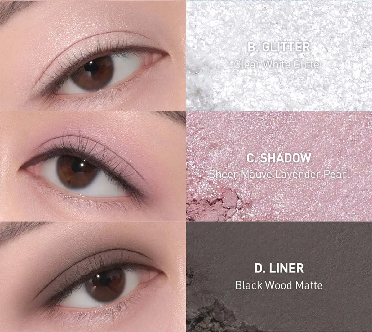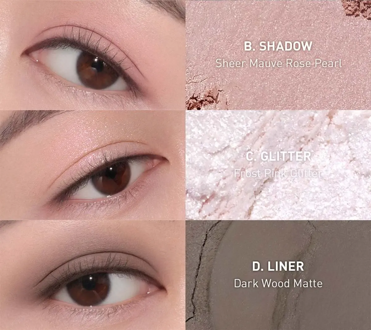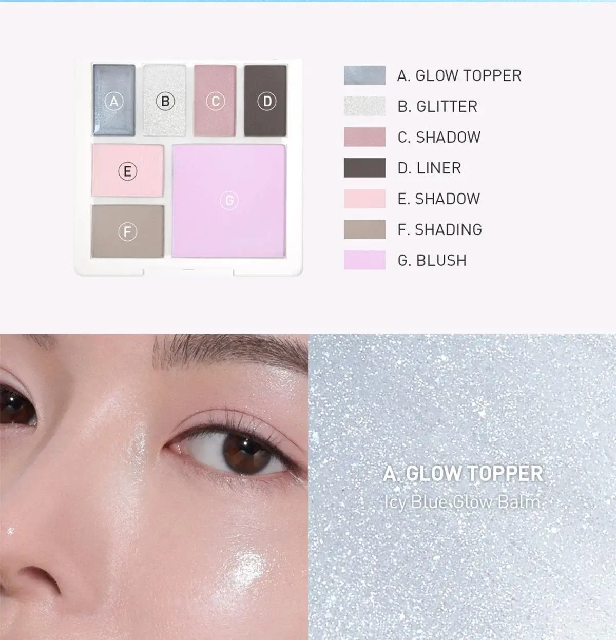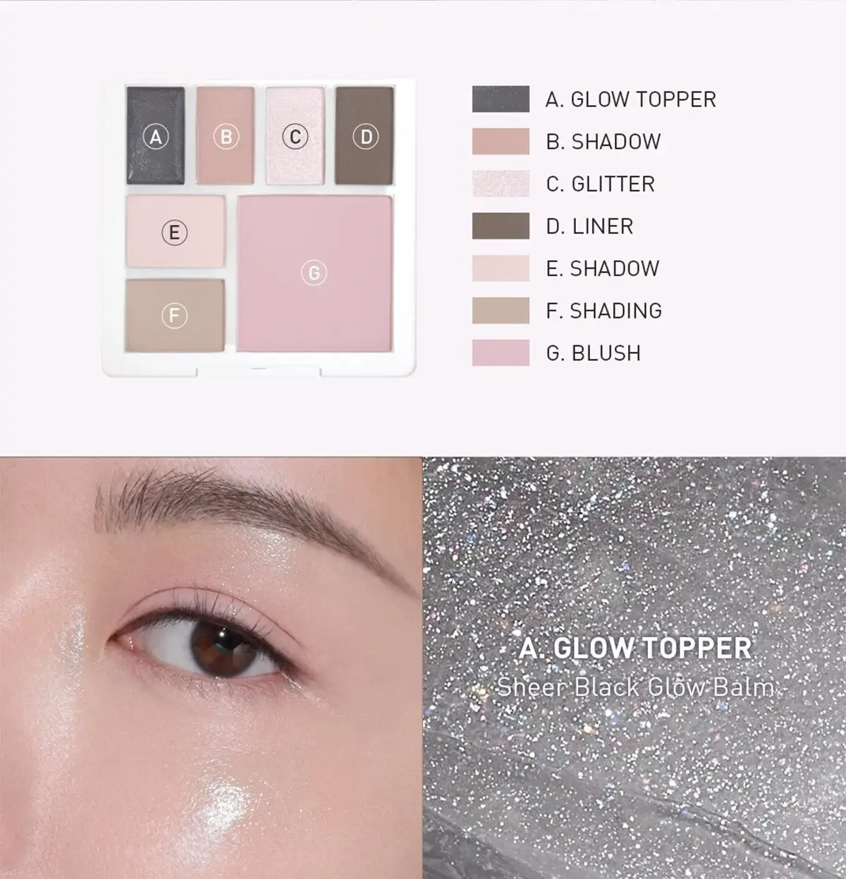 • Eyeshadow: The palette contains multiple shades and textures (mattes, shimmers, and glow balms) that can be applied to the eyelids to create a variety of eye makeup looks.
