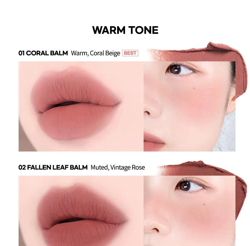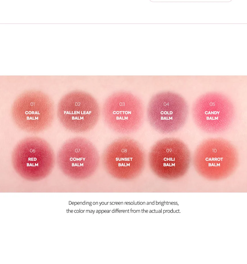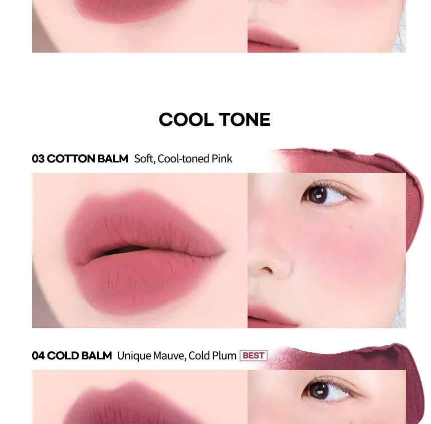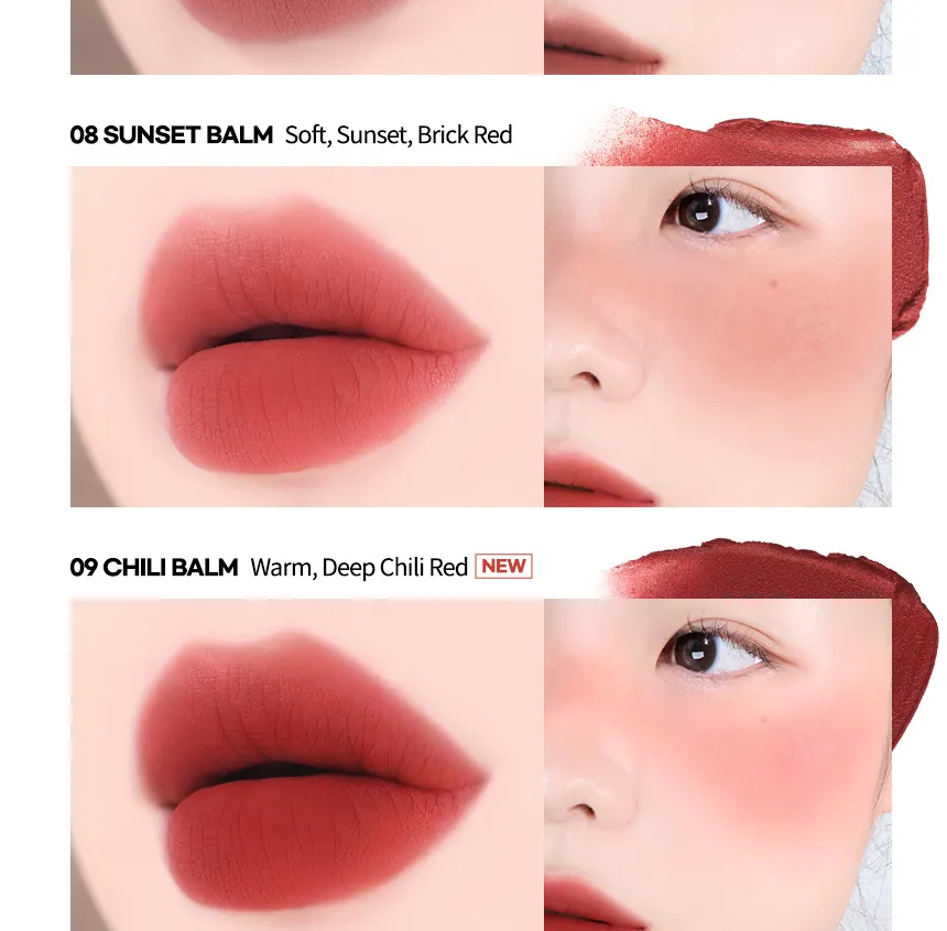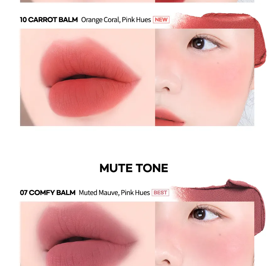- Lips: Apply the balm to the lips using fingers or a makeup puff to achieve a smooth, colored, matte finish.