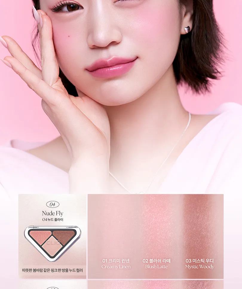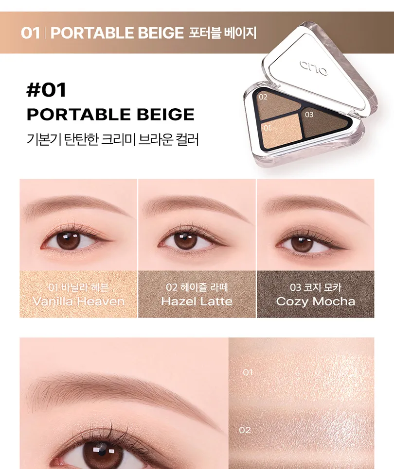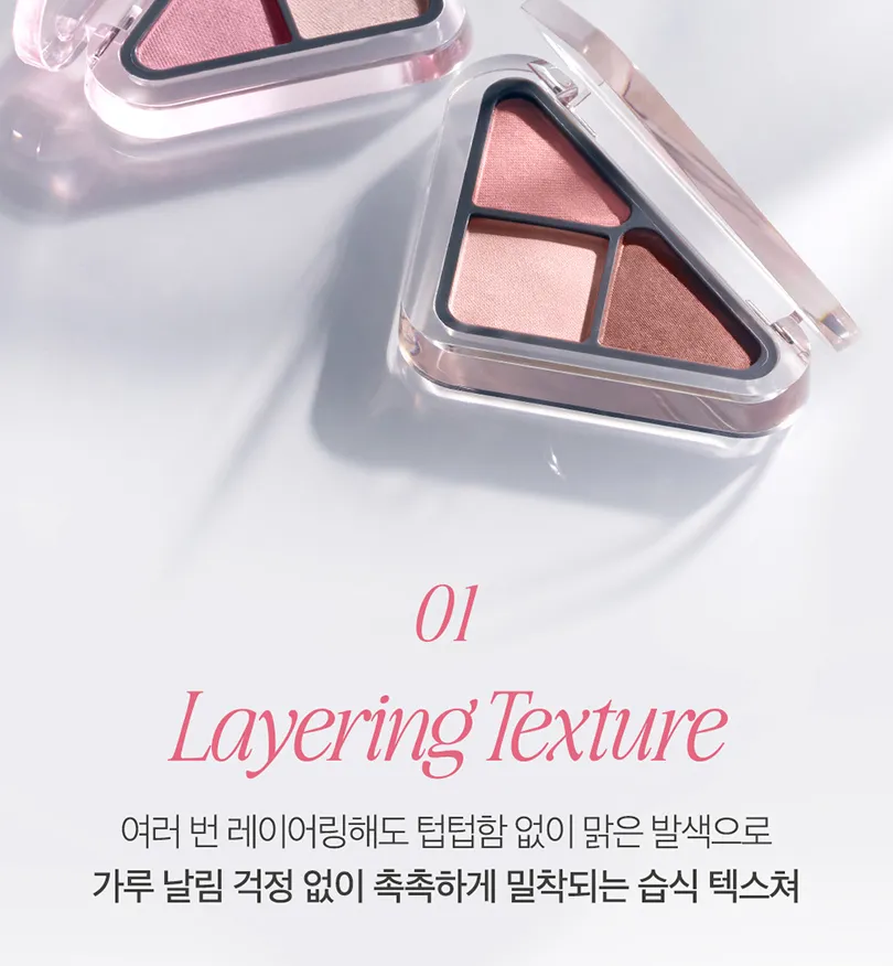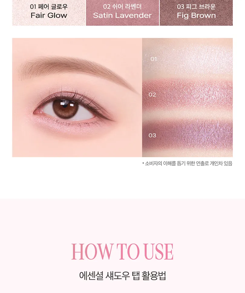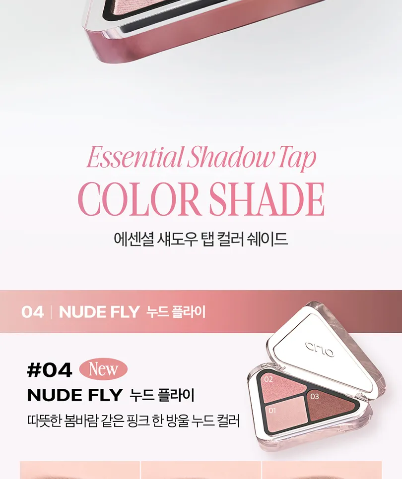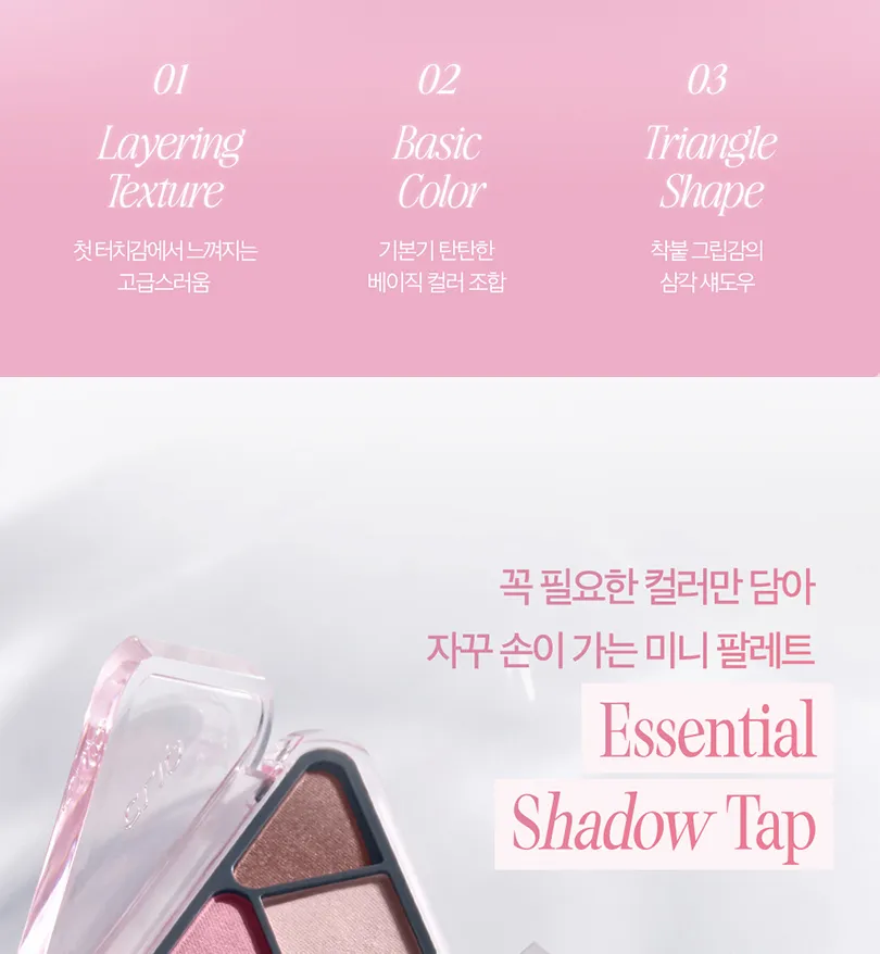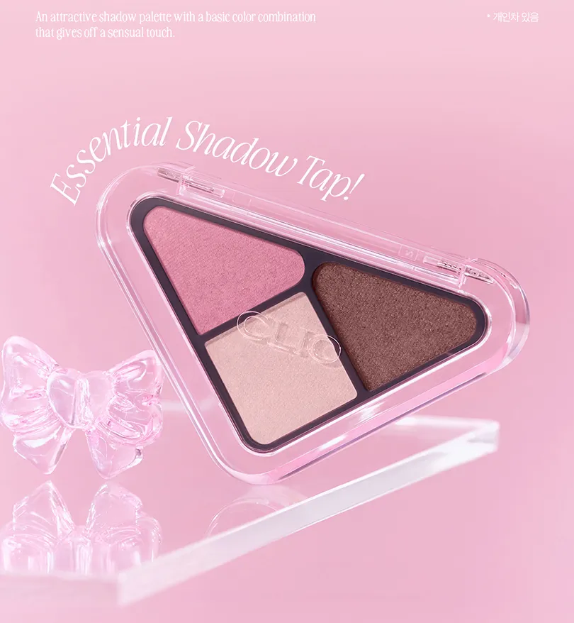 The CLIO Essential Shadow Tap is a compact 3-shade mini eye shadow palette designed for creating daily looks with a moisture-infused, wet-texture powder formula. Its primary functions include providing high adhesion without fallout, enabling seamless layering for a radiant, glowing, and natural finish.