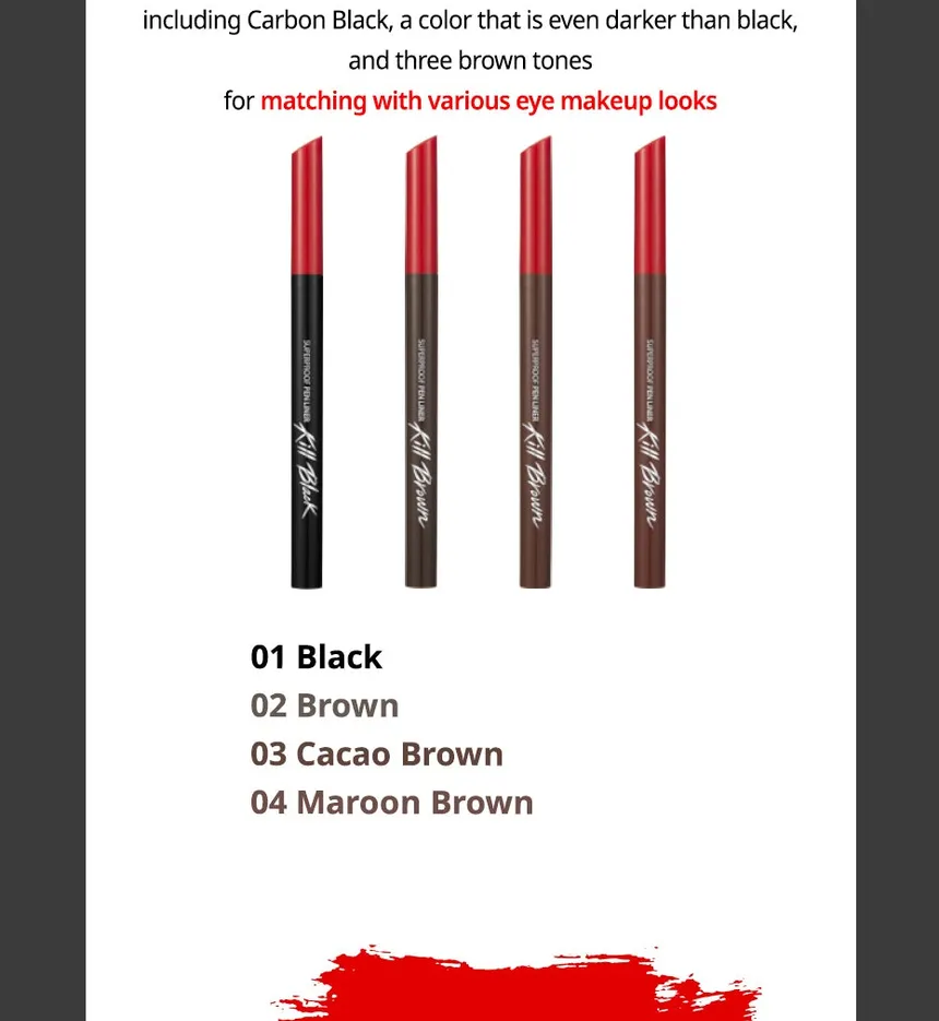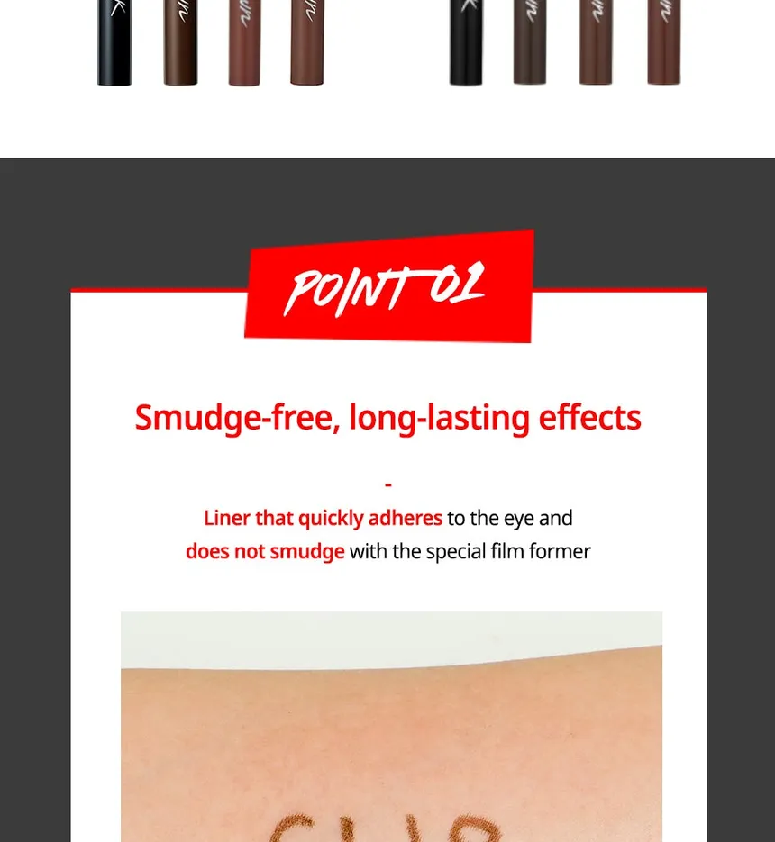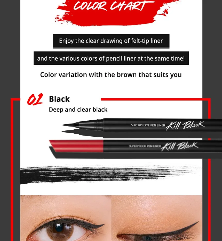 - Versatility: Available in various finishes (matte or glossy) and multiple shades of black and brown, the liner can be used to create a wide range of eye looks, from natural, everyday definition to more dramatic styles.