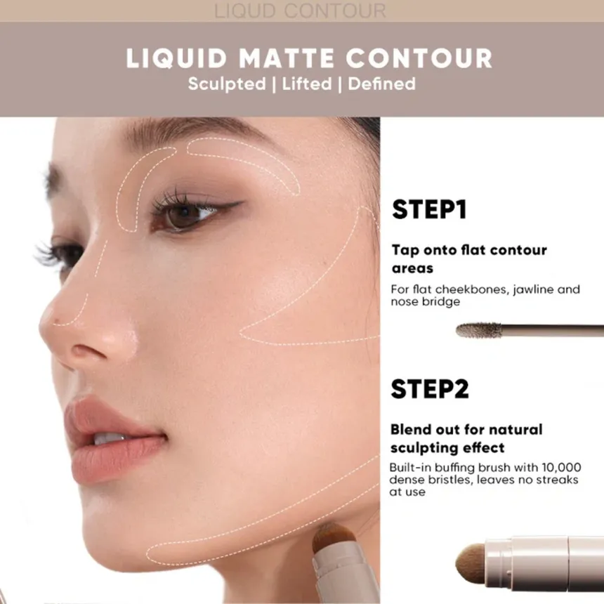 - Sculpting and Defining: The contour end is specifically formulated to mimic natural shadows (cool-toned, often taupe or ash brown) to create depth on the sides of the nose, hollows of the cheeks, and along the jawline.