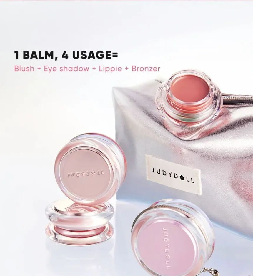 The Judydoll Watery Multiuse Color Balm is a 4-in-1 multitasking makeup product designed for the whole face. It functions as a lip tint, blush, eyeshadow, and contour/bronzer.