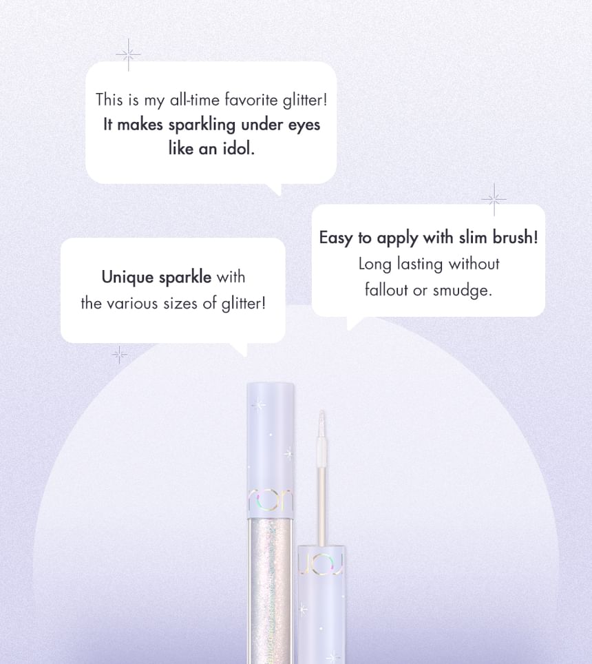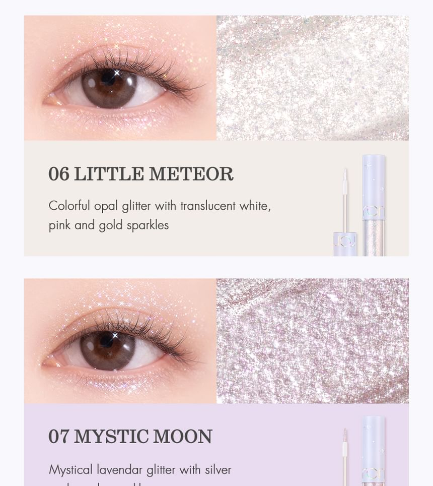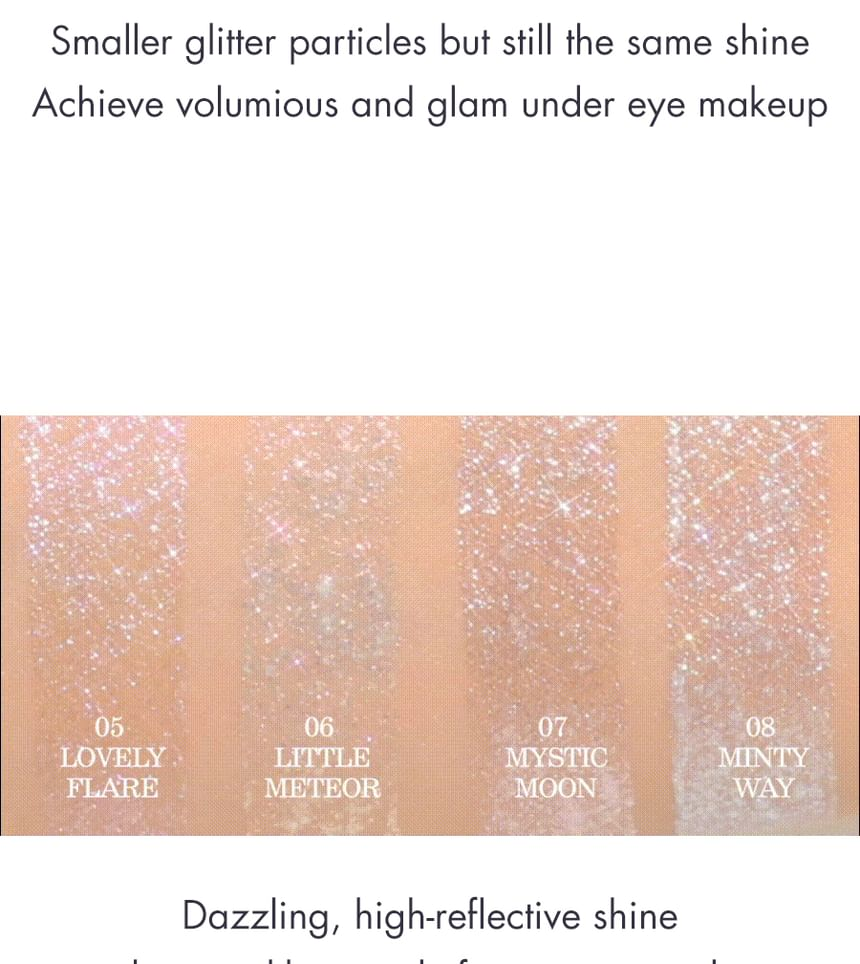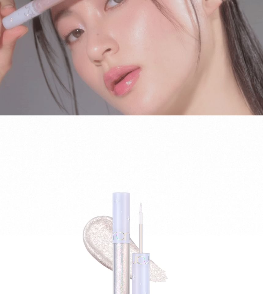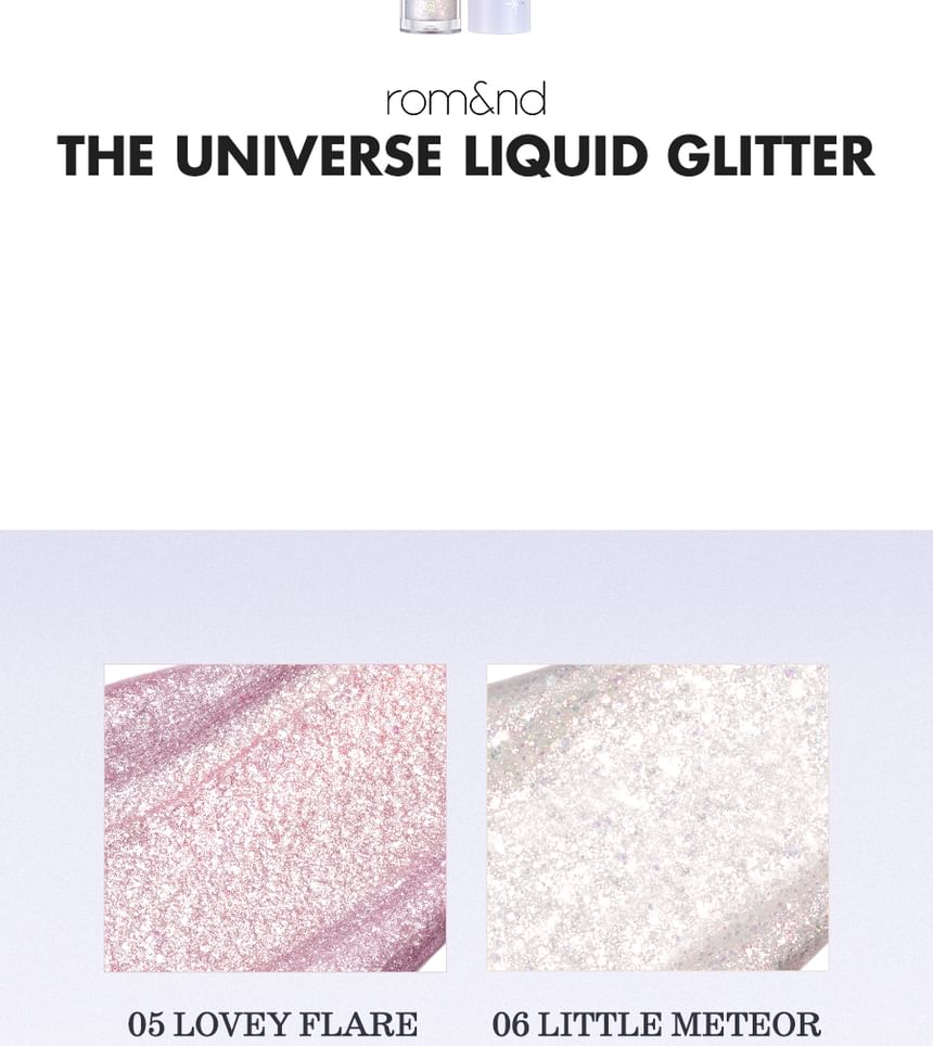 The Rom&nd The Universe Liquid Glitter #05 Lovey Flare functions as a liquid glitter eyeshadow/eyeliner designed to add sparkle, shine, and a "glass tear" effect to eye makeup.