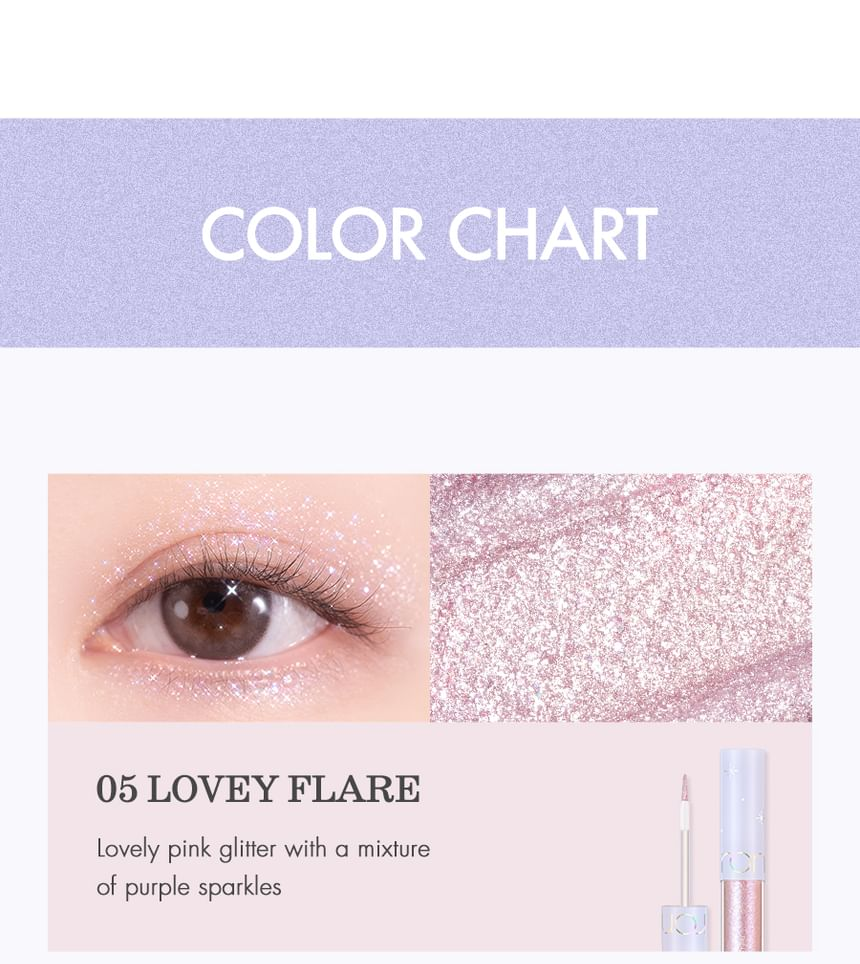 - Shade: #05 Lovey Flare is described as a romantic pink with a mixture of whimsical purple sparkles.
